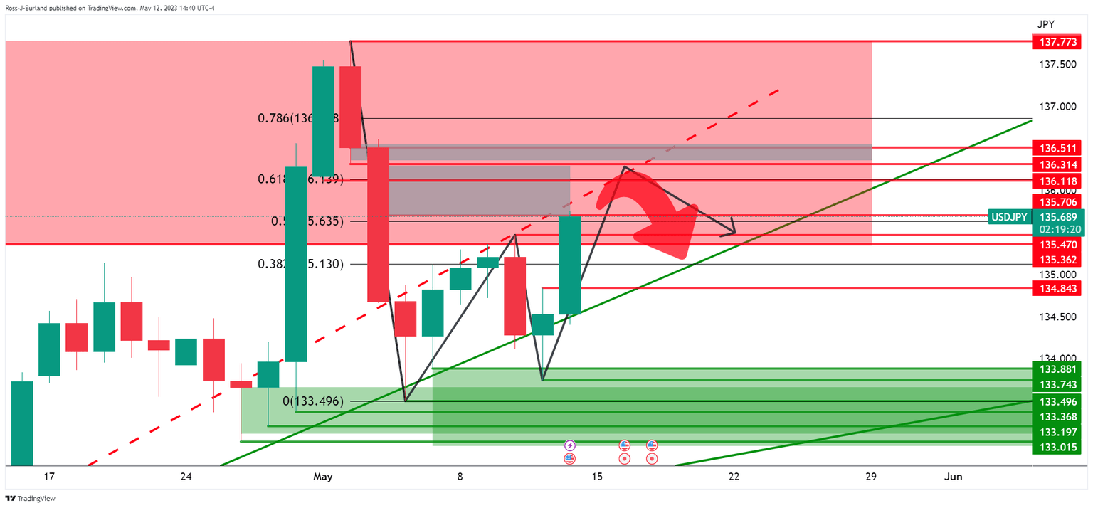 USD/JPY has had a good run on the day, bursting up into the 135.70s. The market is trending back up into the start of May´s sell-off and a resistance area while being on the front side of the bullish trendline as the following analysis will show: