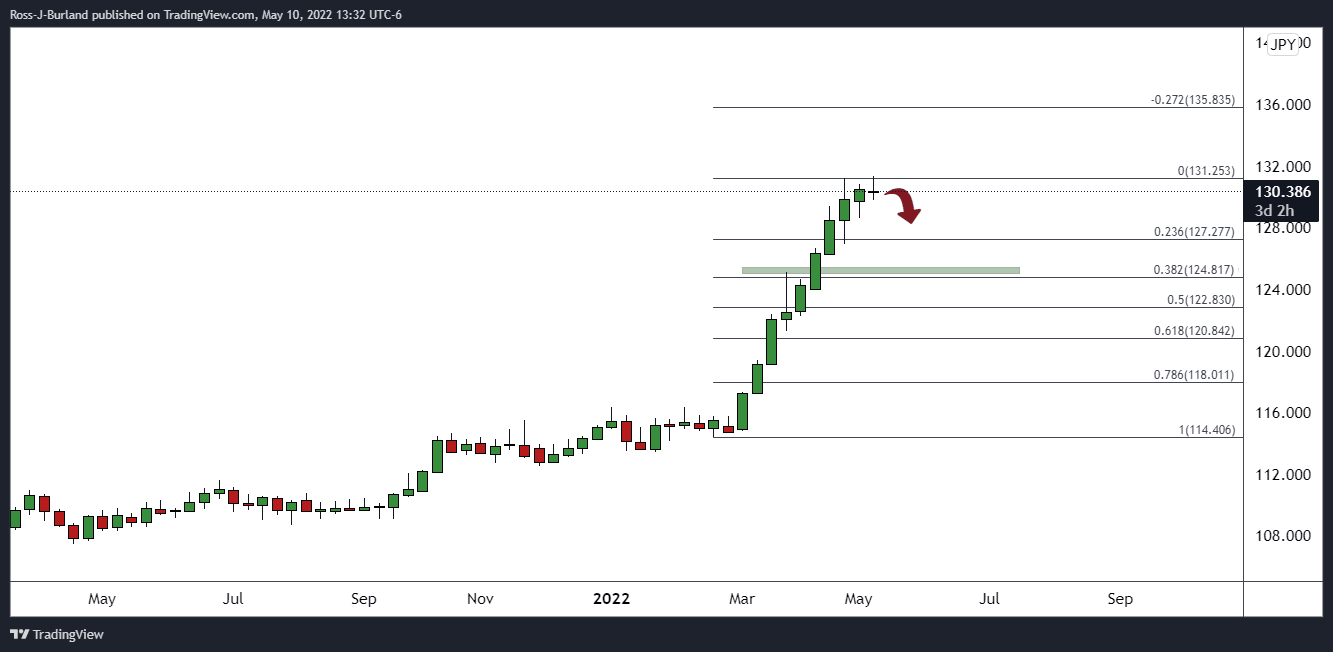 The price has made nine consecutive bullish weekly closes and a doji left on this week's candle could be the signal to the bears to keep the pressure on. A correction to the 38.2% Fibonacci level requires a break of the psychological 125 figure.