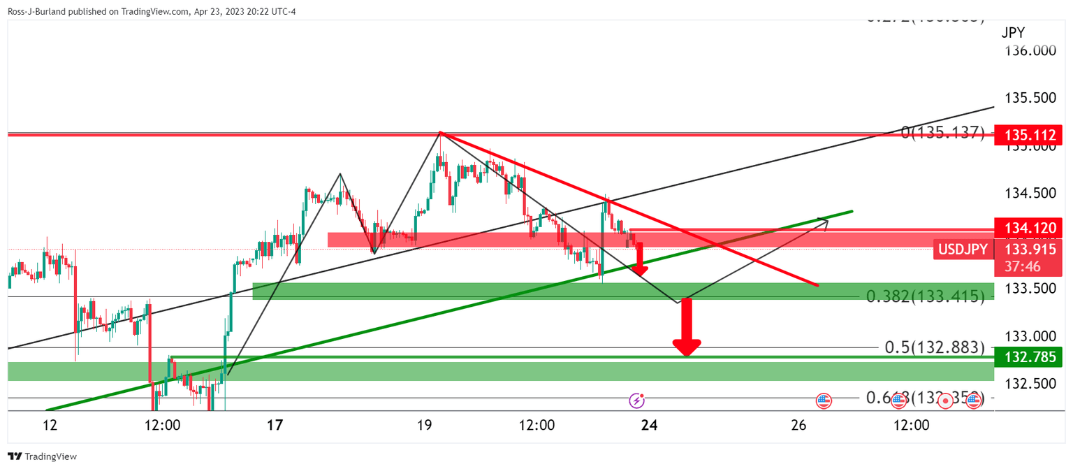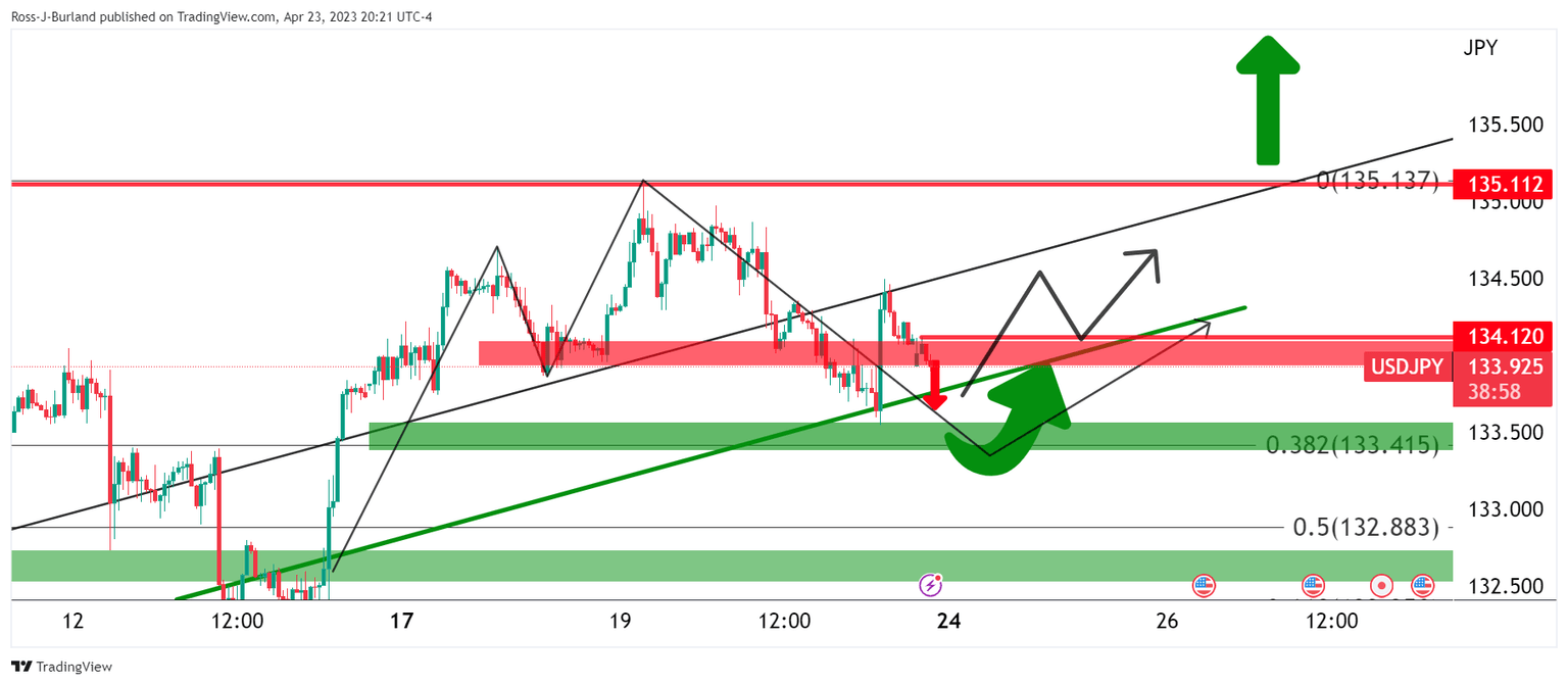 USD/JPY has been offered as the Yen on Friday posted modest gains on signs of strength in Japan’s economy boosted by Japan’s Mar national inflation data that rose more than expected and by the most in 41 years, and a gauge of Japan’s manufacturing activity rose to a 6-month high. Technically, however, the bias remains bullish while above 132.80 and certainly while on the front side of the broader trendline.