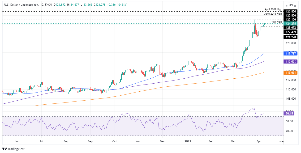The USD/JPY is set to finish the week above the 124.00 mark for the first time in the year, though short of the YTD high at 125.10, amid a mixed market mood and upward pressured US Treasury yields. At the time of writing, the USD/JPY is trading at 124.27