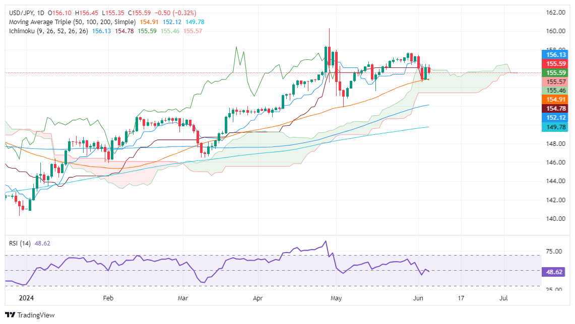 The USD/JPY registered modest losses of 0.30% on Thursday, as the Greenback remains on the backfoot ahead of crucial US jobs data on Friday. Nevertheless, a soft US JOLTS report, followed by ADP Employment Change missing estimates, could be a prelude to May’s Nonfarm Payrolls report. Therefore, the major remained pressured and traded at 155.60 after hitting a high of 156.44.