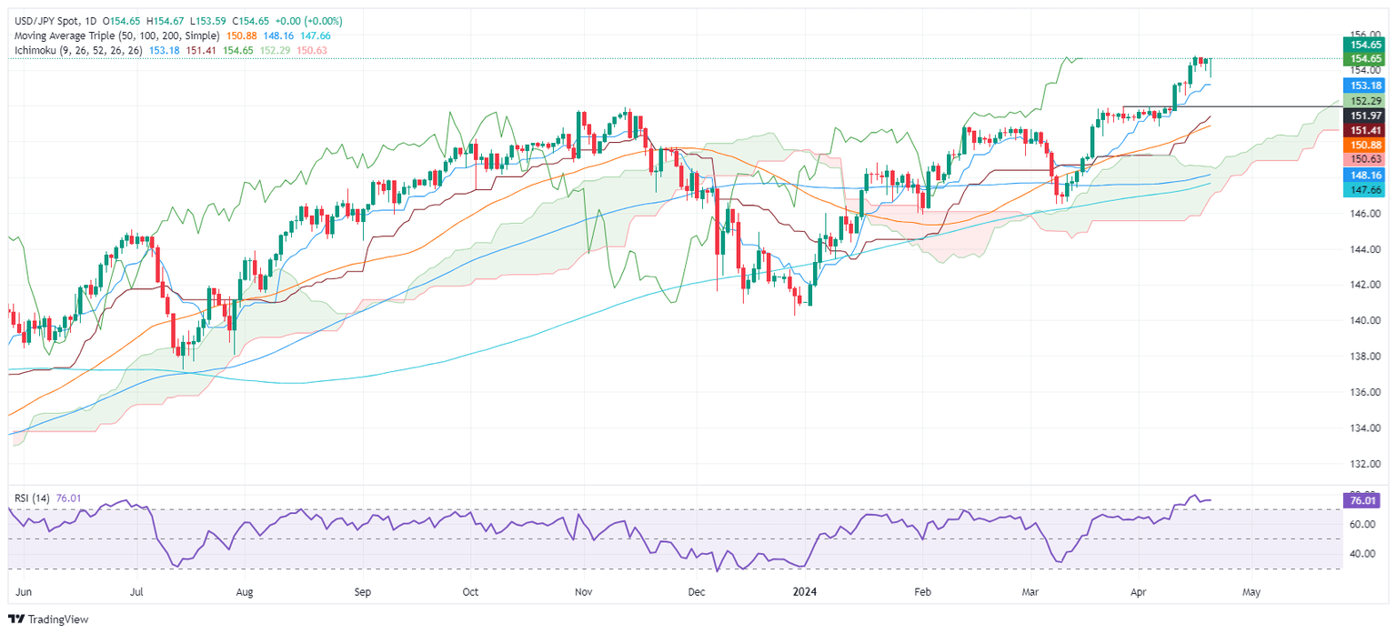 Otherwise, if sellers stepped in and pushed the exchange rate below 154.00, that would pave the way for a pullback. The first support would be the Tenkan-Sen at 153.18. Further weakness in the USD/JPY would drive prices past the Senkou Span A at 152.29, followed by the Kijun Sen at 151.41. Up next lies the 50-day moving average (DMA) at 150.89.