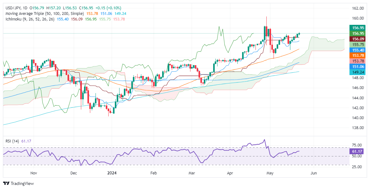 - USD/JPY rises, trading at 156.86, nearing the key psychological resistance at 157.00.