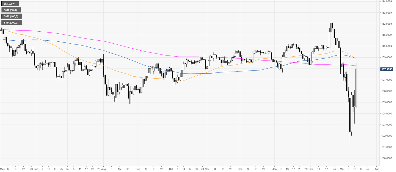 USD/JPY is reversing up from three-year lows while trading below the simple moving averages (SMAs) as the US equity markets are bouncing after one of the worst sessions since 1987 this Thursday. The Coronavirus narrative is leading to hysteria and panic worldwide in an unprecedented alarmist message from mass media for a case of pandemic flu. Additionally, this Friday, the University of Michigan's initial gauge of consumer confidence came in at 95.9 above the 95 level.