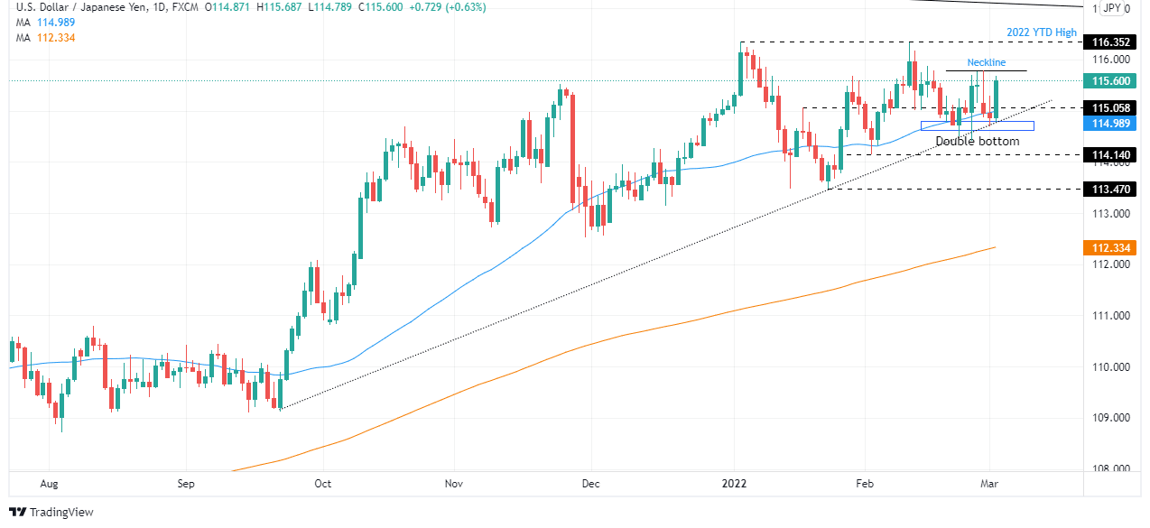 Market mood improvement, spurred by reports of another round of talks between Russia-Ukraine, and higher US Treasury yields benefited the greenback. The USD/JPY rallies for the first time in the week, up some 0.70% in the day, trading at 115.63 at the time of writing.