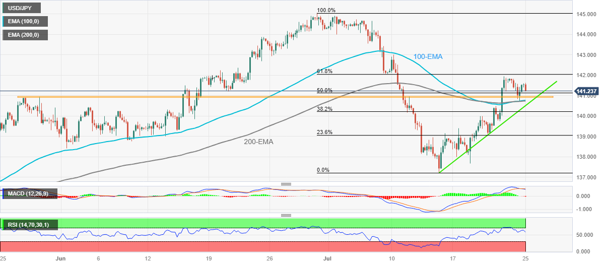 On the flip side, the latest peak of 141.95 and the 61.8% Fibonacci retracement of the pair’s June 30 to July 14 downside, near 142.05, can challenge the USD/JPY pair’s recovery moves.