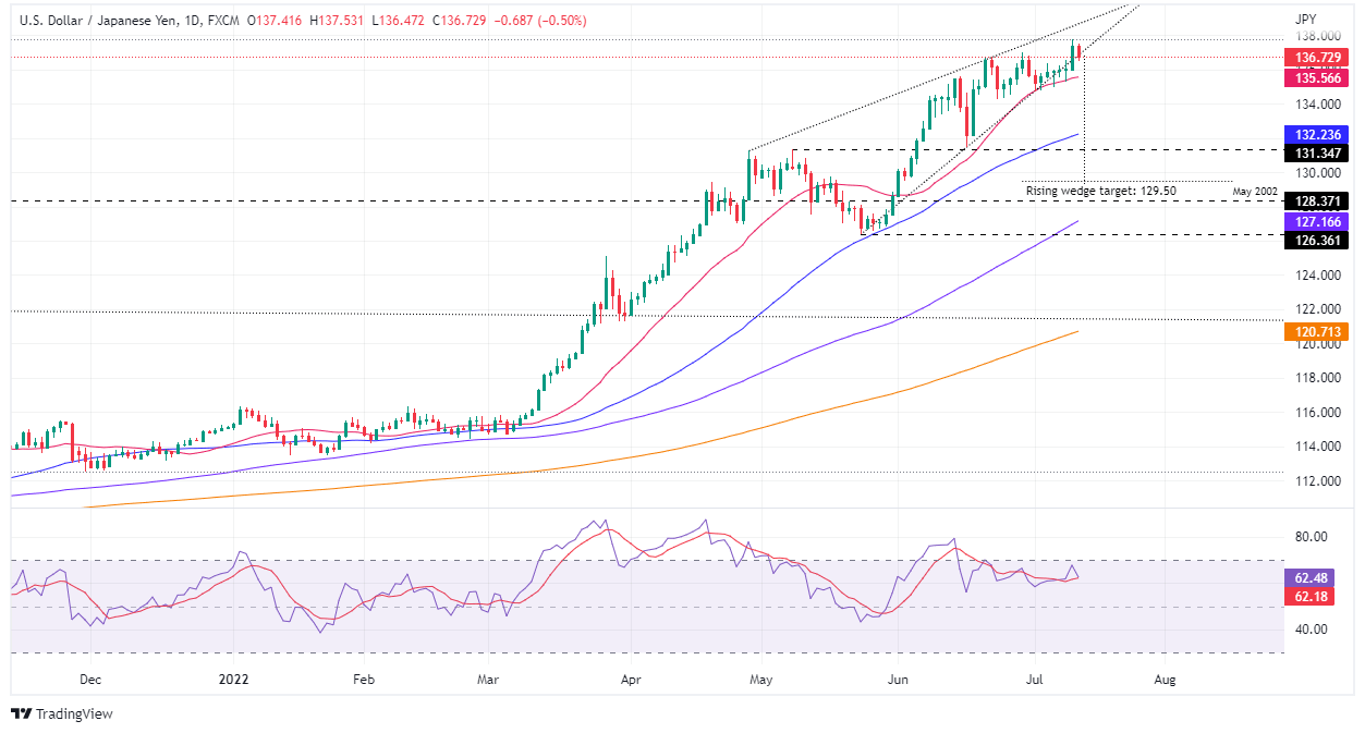 - USD/JPY Price Analysis: The major remains upward biased, but a rising wedge has formed, which targets a fall towards 129.50.