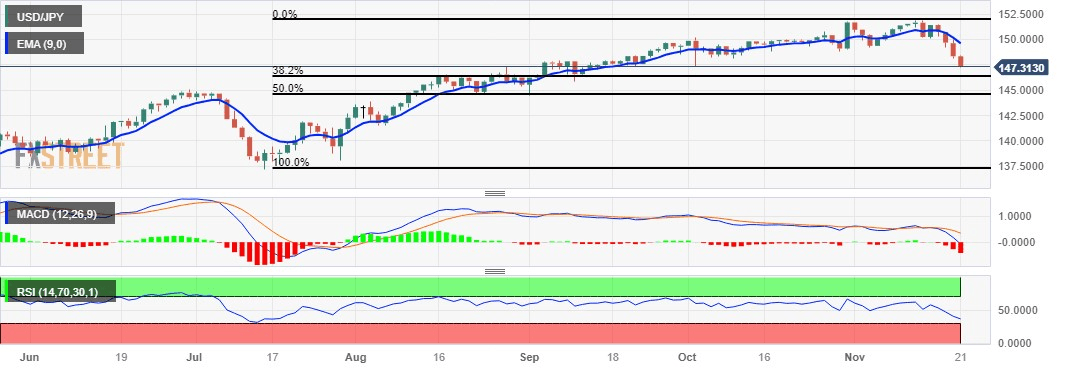USD/JPY extended the losing streak that began on Thursday and marked an eight-week low, trading around 147.40 during the European session on Tuesday. The 147.00 psychological level emerges as the immediate support following the 38.2% Fibonacci retracement at 146.32.