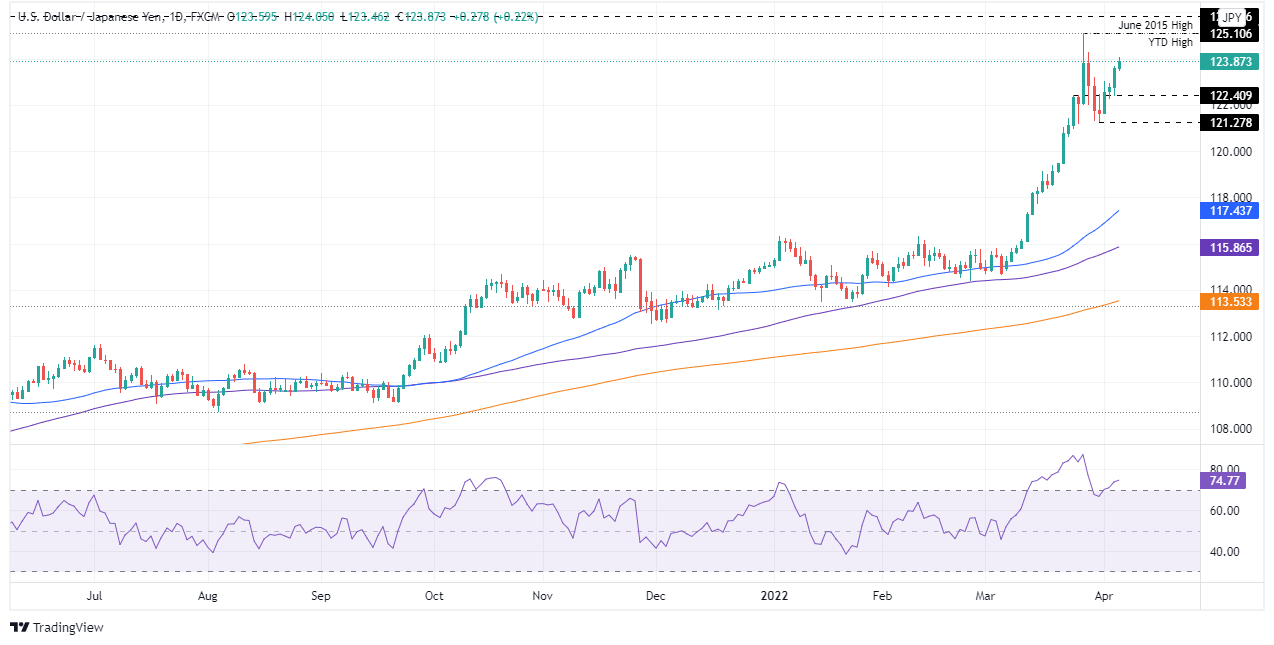 The USD/JPY advances in the North American session amid a risk-off market mood, courtesy of Fed speaking, the continuation of the Russian-Ukraine war, and China’s economy about to slow, as reported by Manufacturing and Services PMIs, which fell below the expansion levels. At the time of writing, the USD/JPY is trading at 123.87.