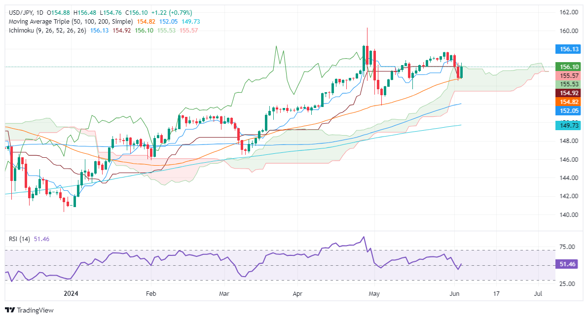 The USD/JPY recovered some ground and advanced towards the top of the Ichimoku Cloud (Kumo) on Wednesday, gaining some 0.79% and trading at 156.11 at the time of writing. Data from the United States kept the Greenback bid while falling Japanese Government Bond (JGB) yields undermined the Yen.