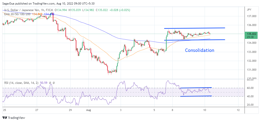 Movement in a marked territory for the past three trading sessions is indicating the unavailability of a potential trigger for a decisive move. The asset is oscillating in a 134.34-135.58 range and is likely to remain lackluster till the announcement of the US Consumer Price Index (CPI) data.