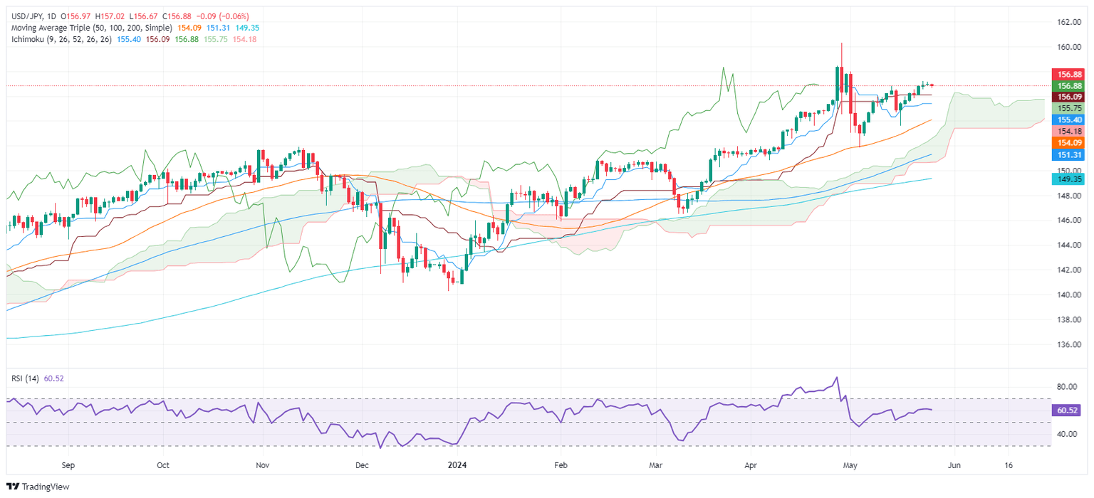 - USD/JPY down slightly by 0.08% at 156.87, amid low-volume trading due to US Memorial Day.