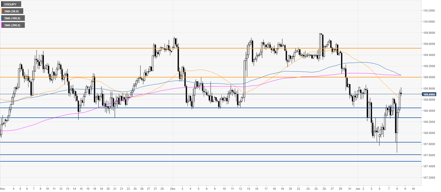 USD/JPY is bouncing from the 108.00 handle and the 100-day simple moving average (SMA). The market is now challenging the 200-day simple moving average (SMA).