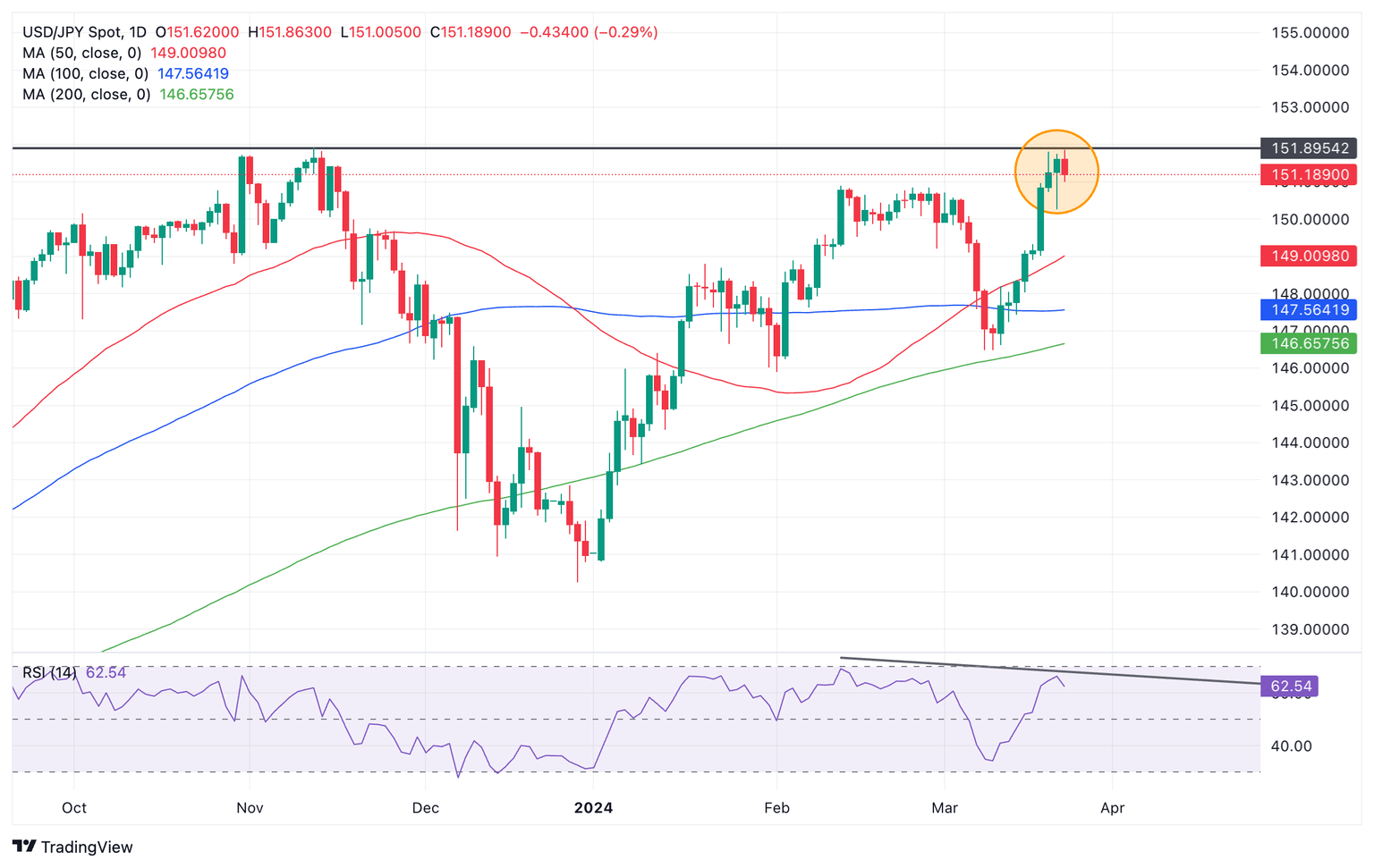 USD/JPY has formed a bearish Hanging Man Japanese candlestick pattern (circled) at key chart highs in the 151.000s on Friday, suggesting a heightened risk of a short-term reversal and pullback.