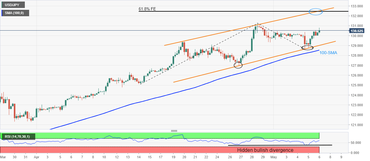 USD/JPY Price Analysis: Hidden bullish divergence, rising channel favor run-up beyond 130.00