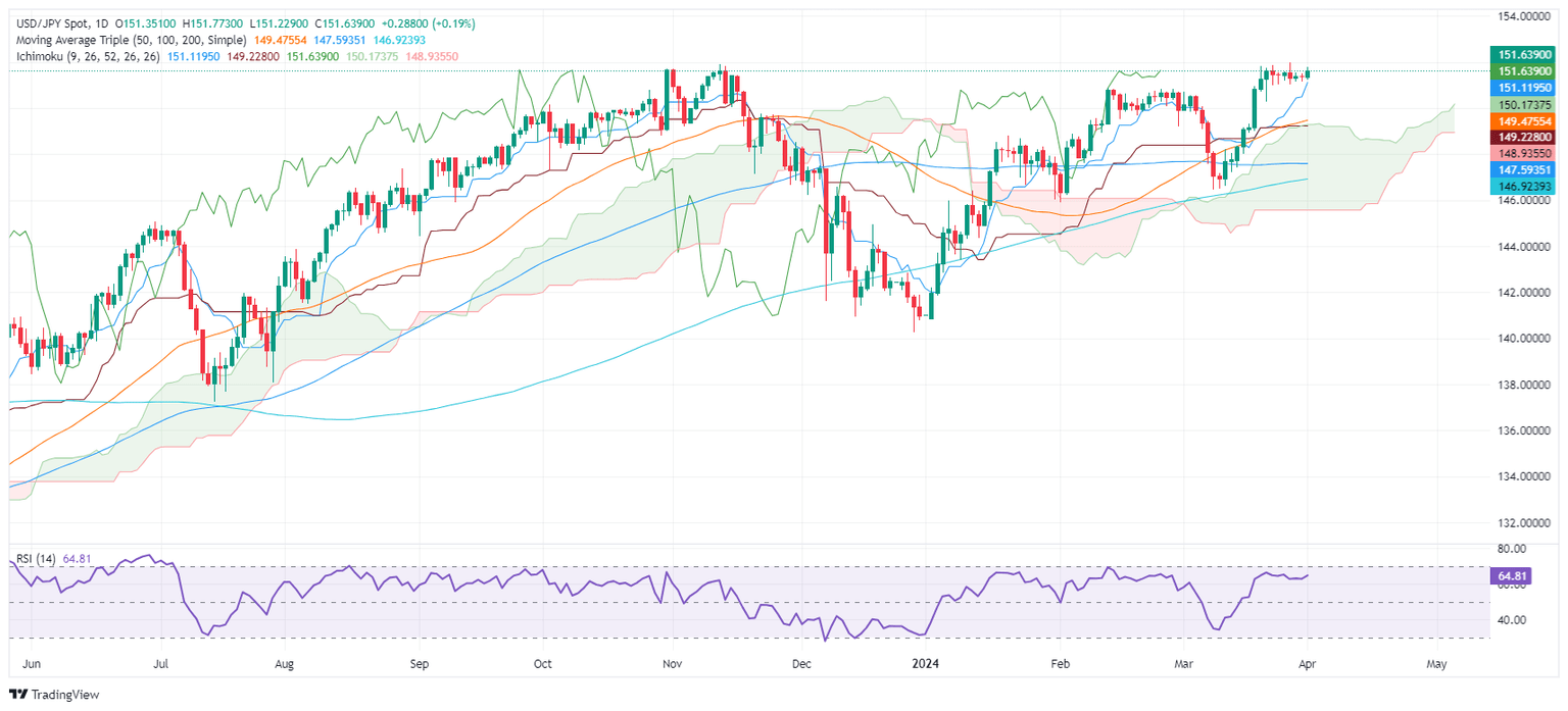 The USD/JPY daily chart depicts the pair consolidating around the 151.00/152.00 region, with intervention threats strengthening the 152.00 mark as a first resistance level. A breach of the latter will expose the 153.00 psychological figure, ahead of 155.00.