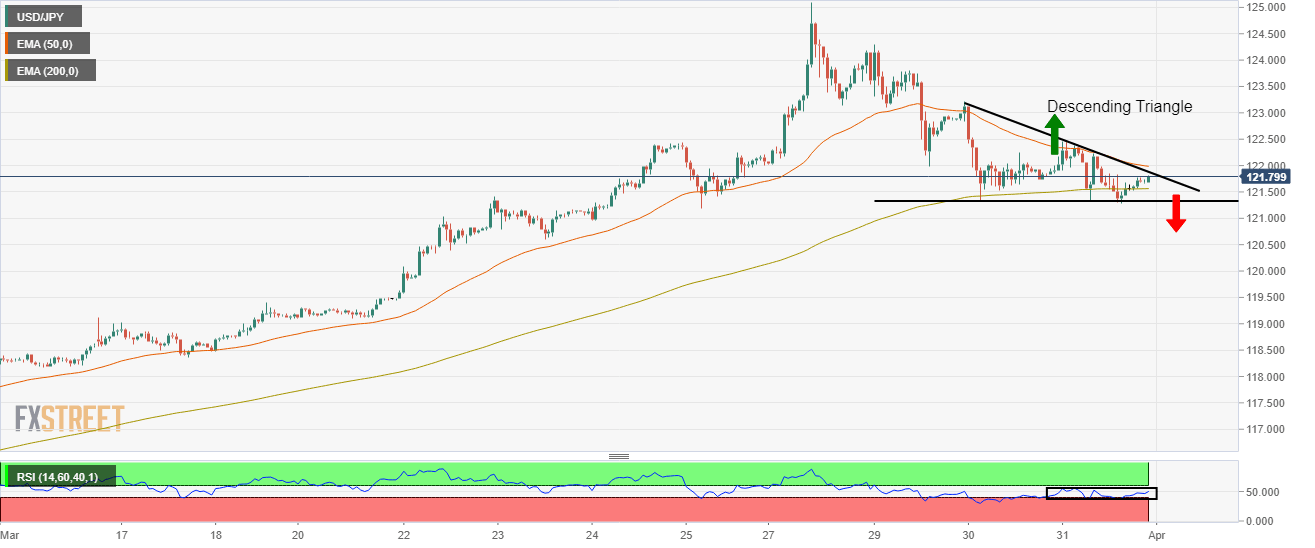 On an hourly scale, USDJPY is sensing a cushion near the mighty 200-period Exponential Moving Average (EMA), which is trading at 121.60 at the press time. The major is auctioning in a descending triangle formation whose downward trending trendline is plotted from March 29 closing price at 123.21 while the horizontal line is placed from March 30 low at 121.31.