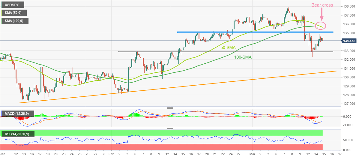 USD/JPY Price Analysis: Justifies bear cross with mild losses near 134.00