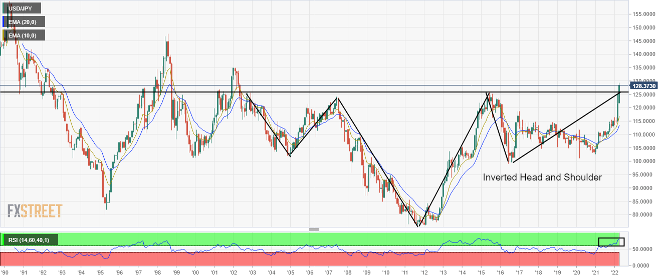 The USD/JPY pair has witnessed a rebound after a minor correction from its multi-year high of 129.41, printed on Wednesday. It won’t be wrong to claim that the asset has resumed its upward journey after a mild correction.