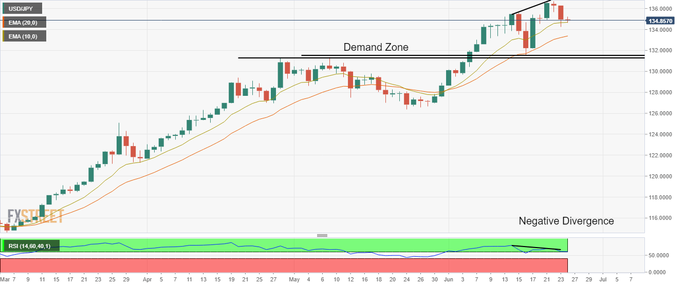 For a downside move, the yen bulls need to violate Thursday’s low at 134.27. The occurrence of the same will drag the asset towards June 9 low at 133.29, followed by the above-mentioned demand zone.