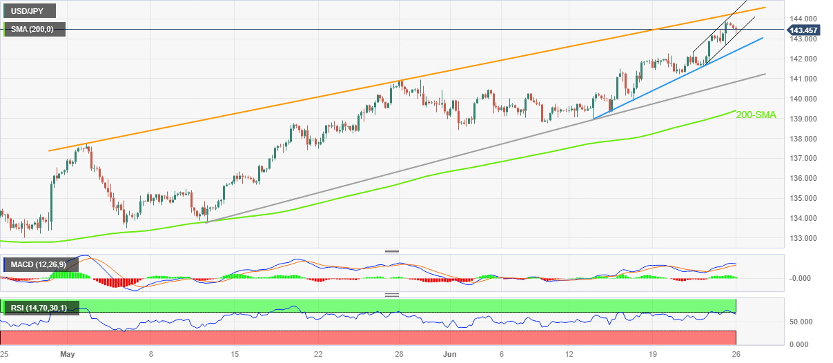 On the flip side, an eight-week-old rising trend line, near 144.30 at the latest, restricts the immediate upside of the USD/JPY pair.