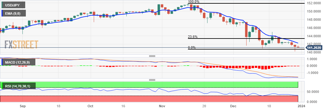 USD/JPY continues to experience declines, driven by the weakening US Dollar (USD) influenced by subdued US bond yields. This trend is likely attributed to the dovish outlook of the Federal Reserve (Fed) in the first quarter of 2024. As of the early European session on Friday, the USD/JPY trades lower around 141.20. The immediate resistance is noted at the 141.50 level, with the next barrier at the 142.00 level.