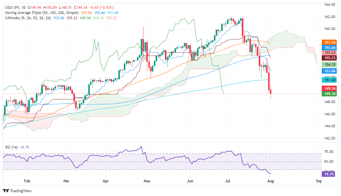 - USD/JPY closes below 150.00 for the first time since March, hitting a five-month low of 148.51.