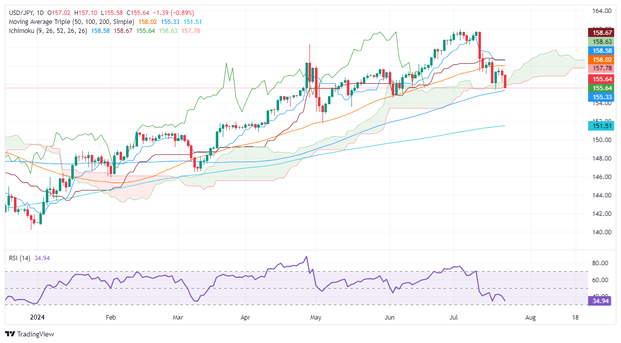 The USD/JPY plummets over 0.85% and drops below the Ichimoku Cloud (Kumo) for the first time since January 15. This is an important milestone yet pending to be confirmed by a daily close below 155.90. At the time of writing, the pair trades at 155.65 after hitting a daily high of 157.10.
