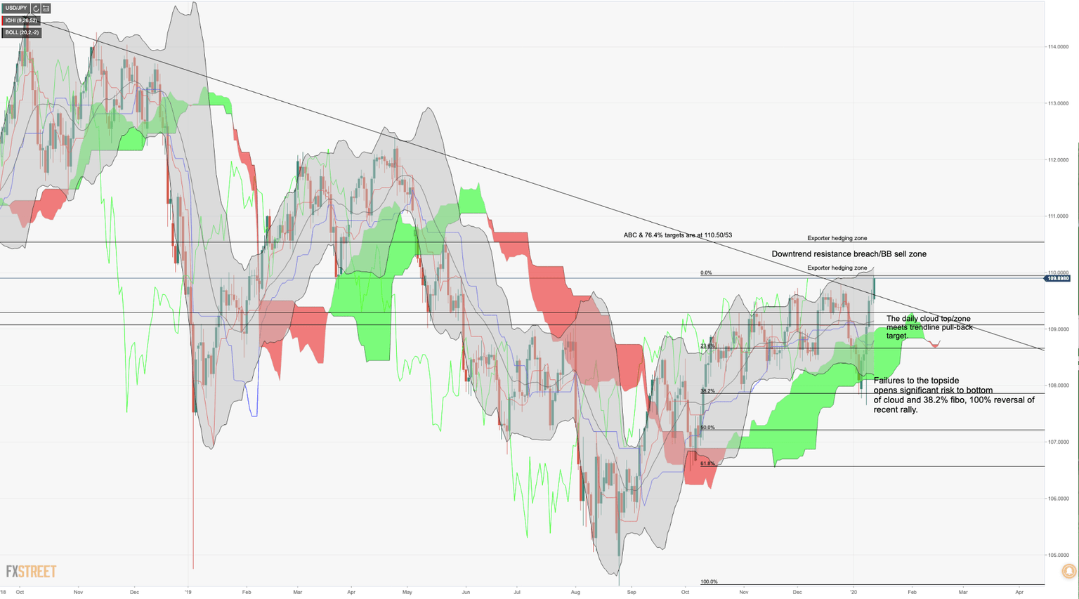 In an extension of the summer 2018 uptrend, bulls have taken out a key resistance (at the Dec 2 high of 109.73) area but now face hurdles in the psychological 110 zone where it meets the resistance of the Bollinger Band and exporter hedging zone.