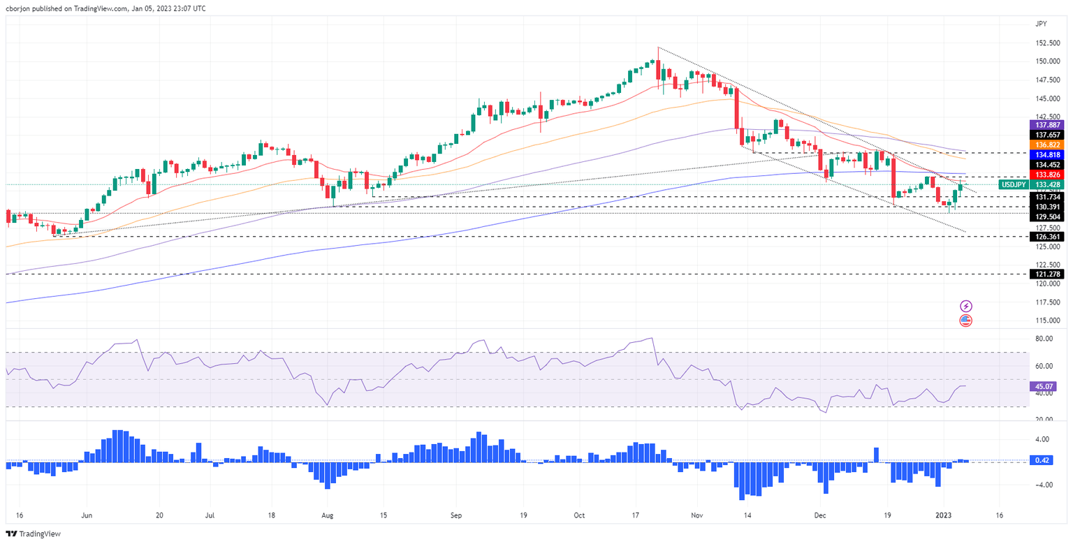 From a technical perspective, the USD/JPY shifted its bias from downward to neutral biased. After the USD/JPY bottomed around 129.50, the major rallied 3% and reclaimed the 133.00 figure. Additionally, it’s testing a four-month-old downslope trendline drawn from 2022 highs above 150.00, which, once broken, could open the door for a test of the 200-day Exponential Moving Average (EMA) at 134.81.