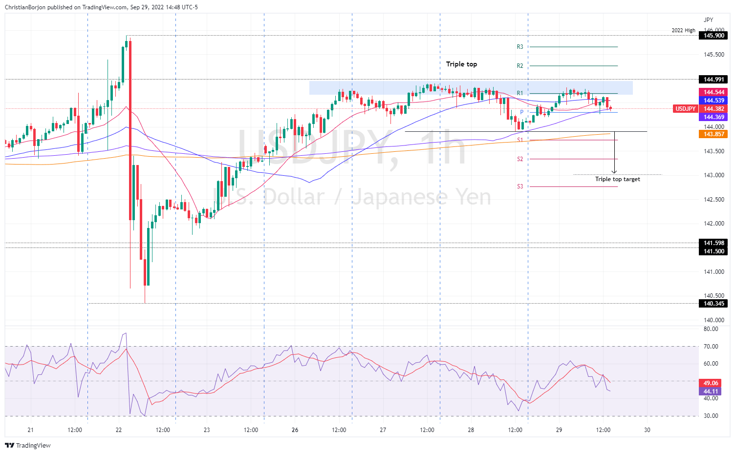 The one-hour chart portrays the USD/JPY as neutral-to-downward biased. At the time of writing, the USD/JPY is testing the 100-EMA, which, once broken, could pave the way towards 143.90, the September 28 daily low. Once cleared, the next support would be the 200-EMA at 143.85, followed by the S1 daily pivot at 143.72, ahead of the triple top target at 143.00.
