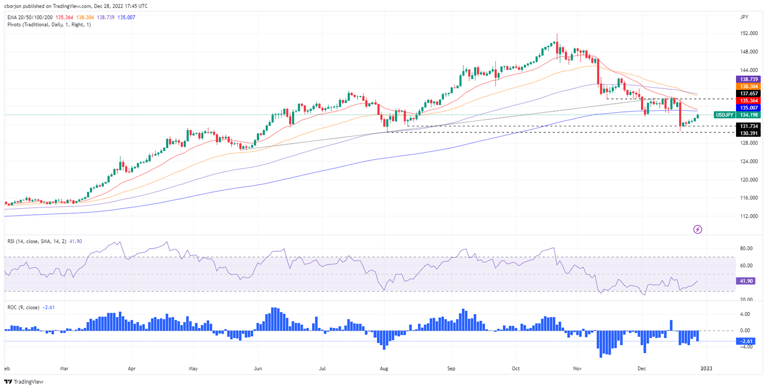 The USD/JPY has advanced steadily since the December 20 500-pip fall after the Bank of Japan (BoJ) removed the cap of 0.25% to the 10-year Japanese Government Bond (JGB), catching traders off guard. Therefore, the Japanese Yen (JPY) strengthened, though it has erased some of its gains. At the time of writing, the USD/JPY is trading at 134.17, up by 0.54%.