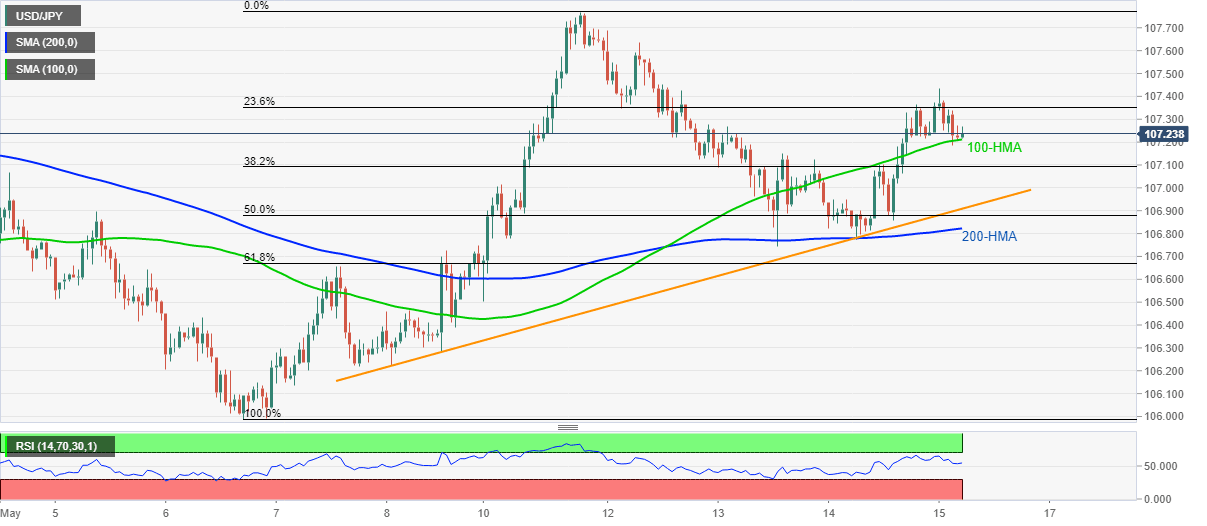 USD/JPY trades near 107.24 as it enters Friday’s European session. The pair recently pulled back from Tuesday’s top but stays above 100-HMA off-late.