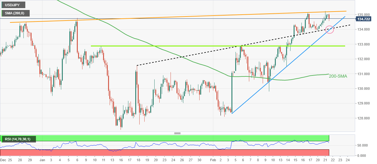 USD/JPY bulls take a breather as the quote drops to 134.70 while printing the mild losses, the first in four days, during early Wednesday. In doing so, the Yen pair portrays a U-turn from the upward-sloping resistance line from late December 2022.