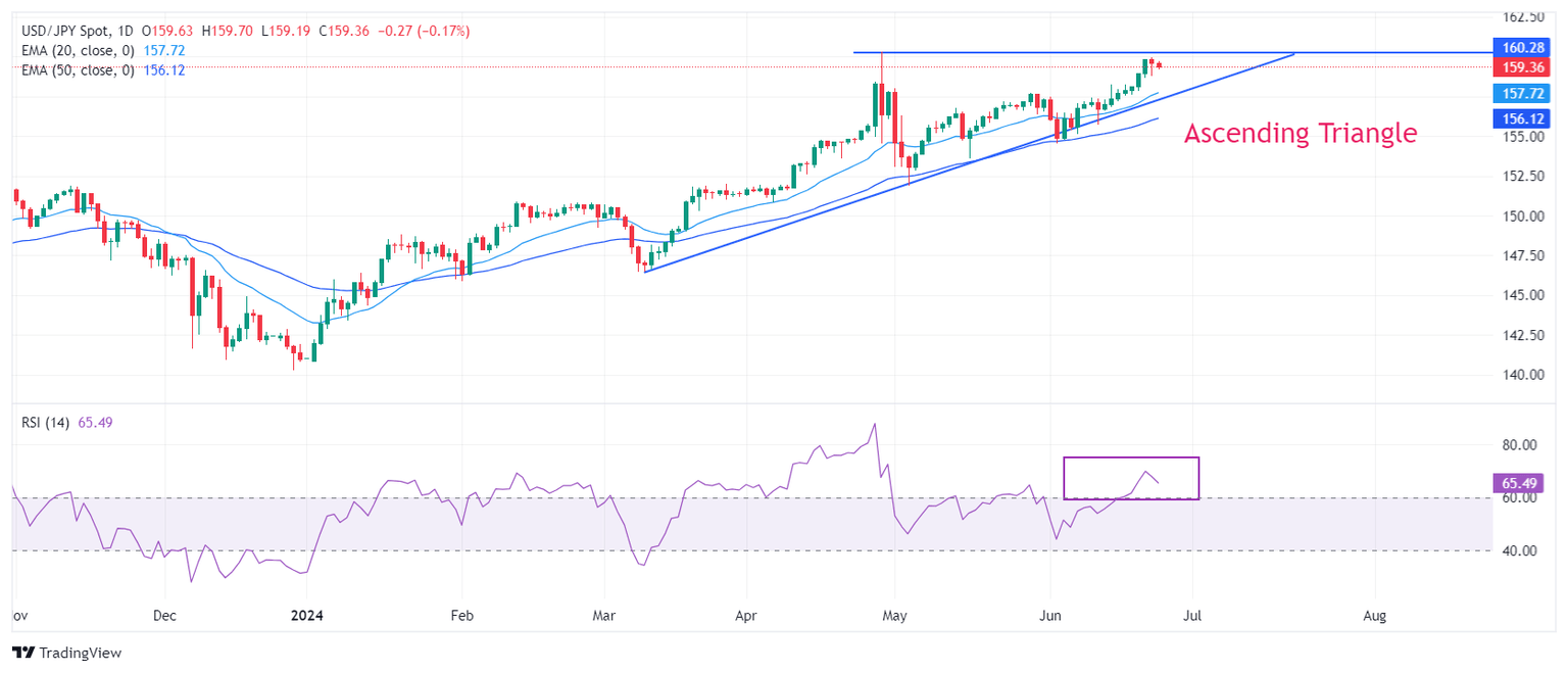 USD/JPY hovers near the horizontal resistance of the Ascending Triangle chart formation on a daily timeframe, which is plotted from April 29 high of 160.32. The upward-sloping border of the above-mentioned chart pattern is placed from March 11 low near 146.50.