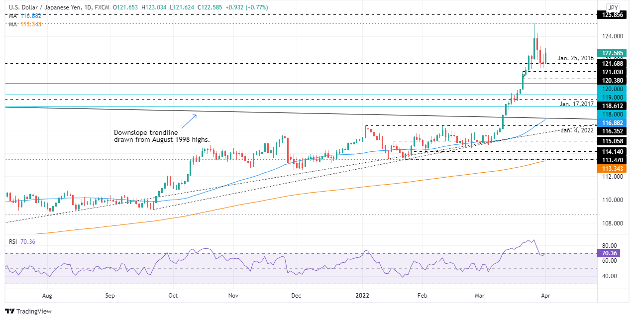 The USD/JPY recovers after dipping 350-pips in the week, rallying above the 122.00 mark on a buoyant market mood and a strong US dollar, lifted by solid US macroeconomic data and prospects of the Federal Reserve hiking rates by 50-bps in the May meeting. At the time of writing, the USD/JPY is trading 122.58.