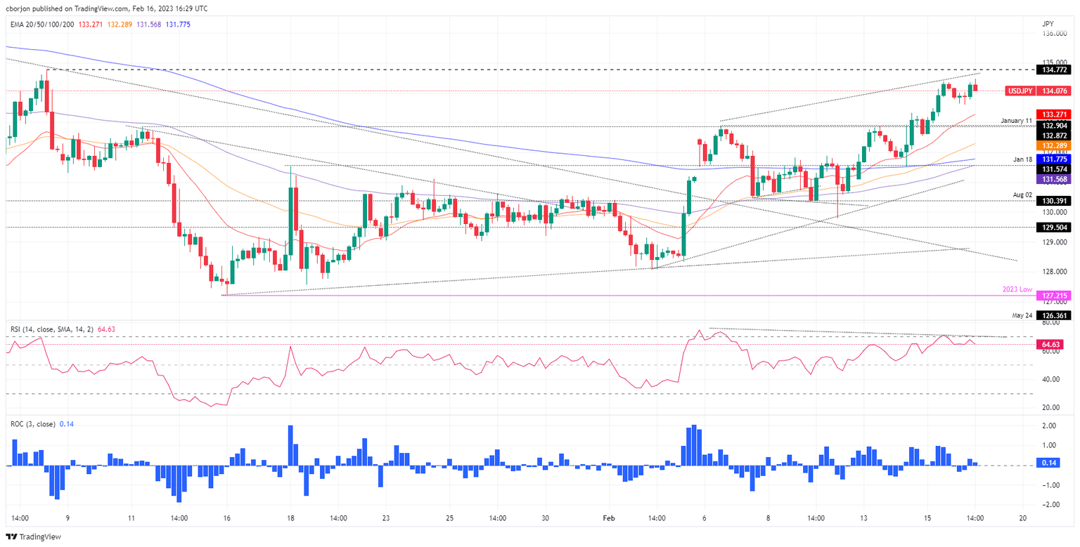 On February 15, the USD/JPY reached a daily high at 134.35, and since then, the USD/JPY has remained sideways within the 133.60/134.30 area. Even though the Relative Strength Index (RSI) is in bullish territory, as USD/JPY price action has headed north, the RSI did not. Hence, a negative divergence could emerge, suggesting that a price reversal looms.