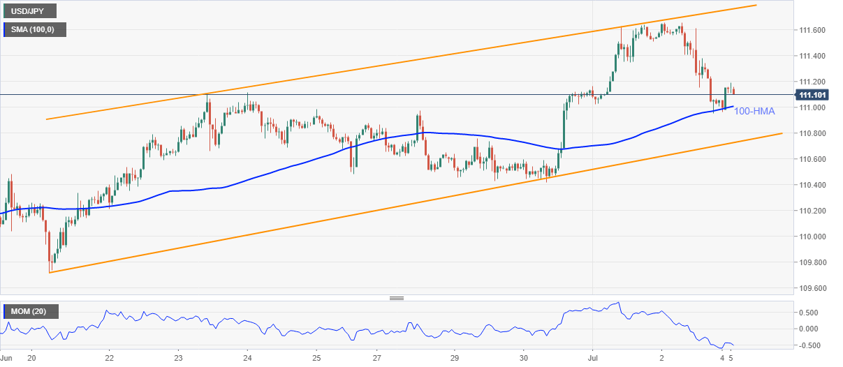 USD/JPY eases from intraday top to 111.12, up 0.07% on a day, amid early Monday. In doing so, the yen pair remains inside a two-week-long ascending trend channel formation while fading the bounce off 100-HMA.