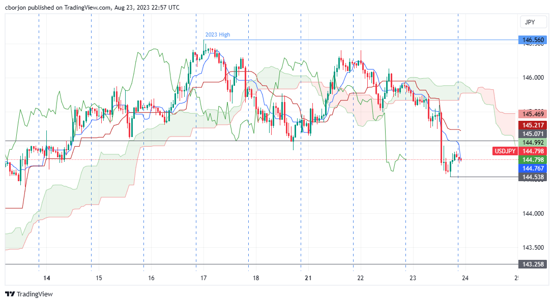 The USD/JPY is neutral to upward biased, but its fall below the Tenkan-Sen line at 145.54 opened the door for further losses. Price action is closing its distance from the Ichimoku Cloud (Kumo), which is still below the exchange rate, maintaining the bullish stance in the pair. But, given the USD/JPY slipped below the June 30 daily high and turned support at 145.07, it suggests the pair could extend its losses.