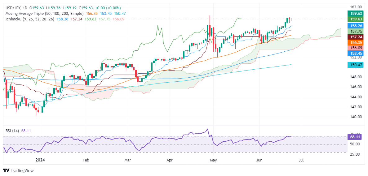 The USD/JPY is flat late in the North American session as US Treasury yields fell. Intervention threats by Japanese authorities refrained traders from pushing the exchange rate above 160.00. At the time of writing, the pair trades at 159.62, unchanged.