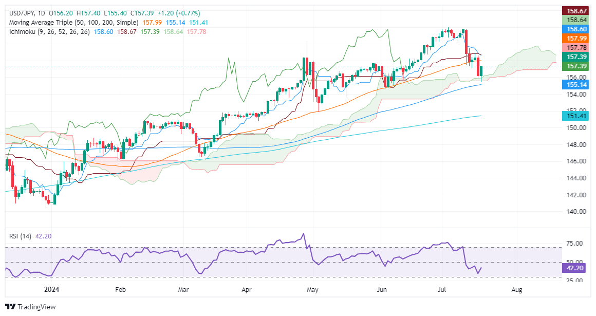 The USD/JPY trims some of its Wednesday losses, bouncing from underneath the Ichimoku Cloud (Kumo) level of 155.37 and rising near the July 15 daily low of 157.14.