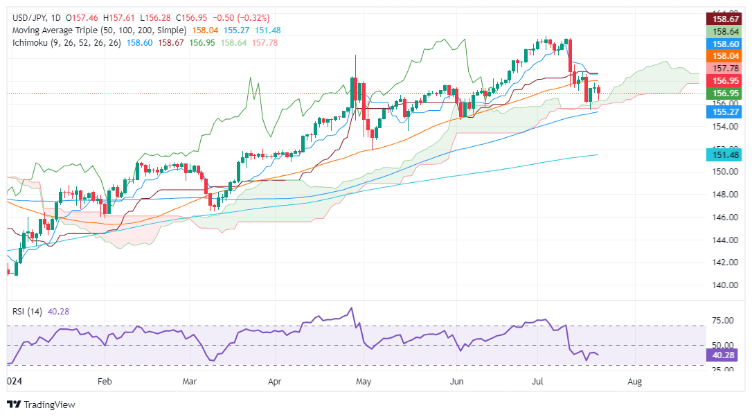 The USD/JPY registered losses of more than 0.20% on Monday, remaining near the top of the narrowest part of the Ichimoku Cloud (Kumo) as traders eye further downside. As Tuesday’s Asian session begins, the pair trades at 156.96, virtually unchanged.