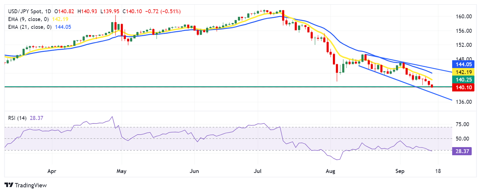 USD/JPY continues to decline for the fifth consecutive day, trading around 140.30 during the Asian session on Monday. An analysis of the daily chart showed the USD/JPY pair moves downward within a descending channel, indicating a confirmed bearish bias.