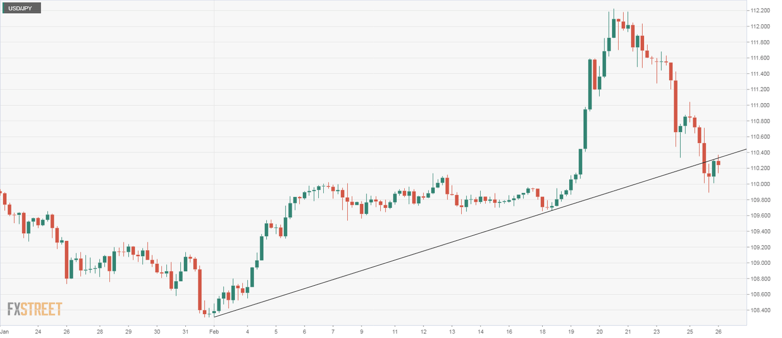 USD/JPY is trimming gains, having failed to take out the resistance of the trendline rising from Feb. 2 and Feb. 18 lows.