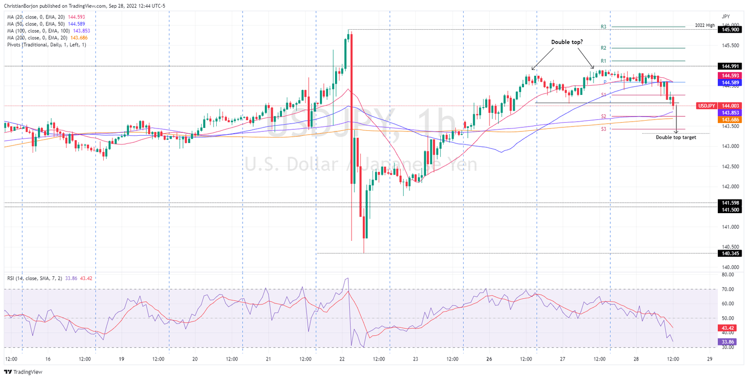 In yesterday’s article, “a double-top chart pattern is emerging at around the 144.60-75 area, which could pave the way for further losses. Nevertheless, the 20 and the 50-EMAs, meandering around 144.51 and 144.16, respectively, would be difficult to surpass.” It should be noted that the USD/JPY initially edged towards the weekly high, forming a “triple top” instead of a “double top,” and fell below the 20 and 50-day EMAs, accelerating the USD/JPY fall below the 144.00 mark.