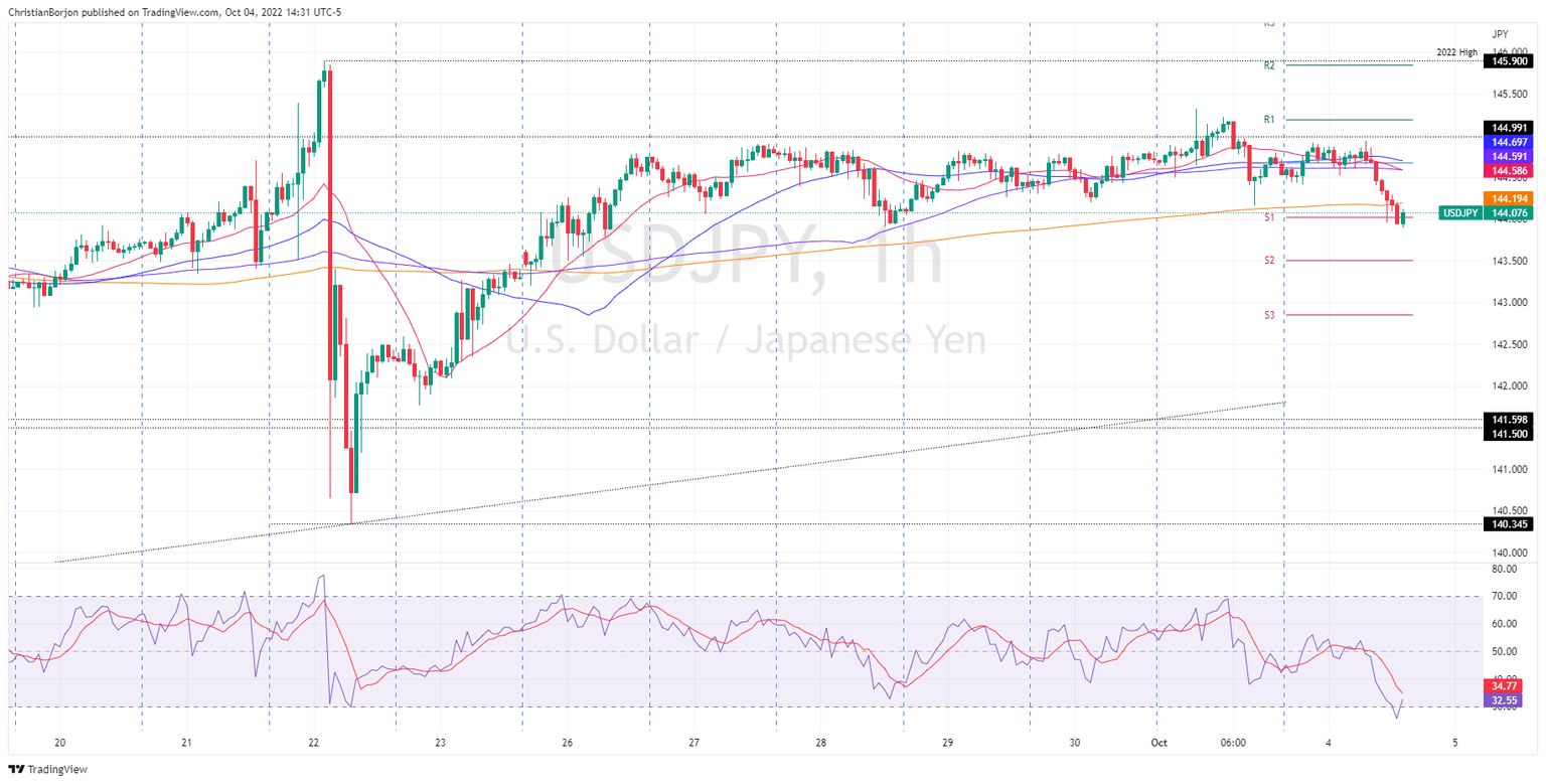 The USD/JPY one-hour scale shows the majors tumbled below 144.67, Tuesday’s daily pivot, and the confluence of the 20, 50, and 100-EMAs, opening the door for further losses. Furthermore, as the USD/JPY heads south, it surpassed the 200-EMA at 144.19, shifting the short-term bias downwards. Albeit the Relative Strength Index (RSI) is at oversold conditions, a fall towards the S2 pivot point at 143.49, ahead of a test of the 143.00 figure.