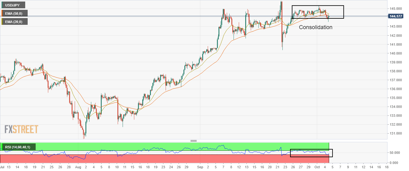 The asset is oscillating minutely below the 20-and 50-period Exponential Moving Averages (EMAs) at 144.43 and 144.28, which doesn’t indicate a bearish reversal for now.