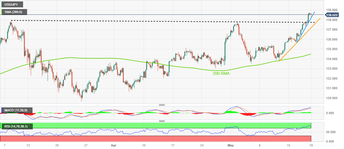 That said, the USD/JPY pair’s latest retreat could be linked to the overbought RSI (14) line, as well as the cautious mood ahead of Federal Reserve (Fed) Chairman Jerome Powell’s speech and US debt ceiling negotiations. However, bullish MACD signals keep the Yen pair firmer at the highest levels since November 2022.