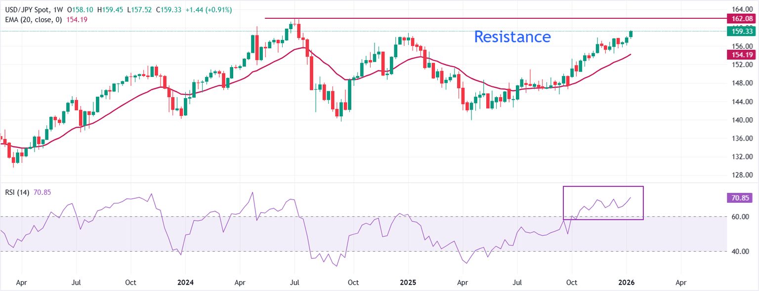 USD/JPY trades higher to near 159.33 at the time of writing. Price holds well above a rising 20-week Exponential Moving Average (EMA) at 154.19, underscoring a strong bullish trend.