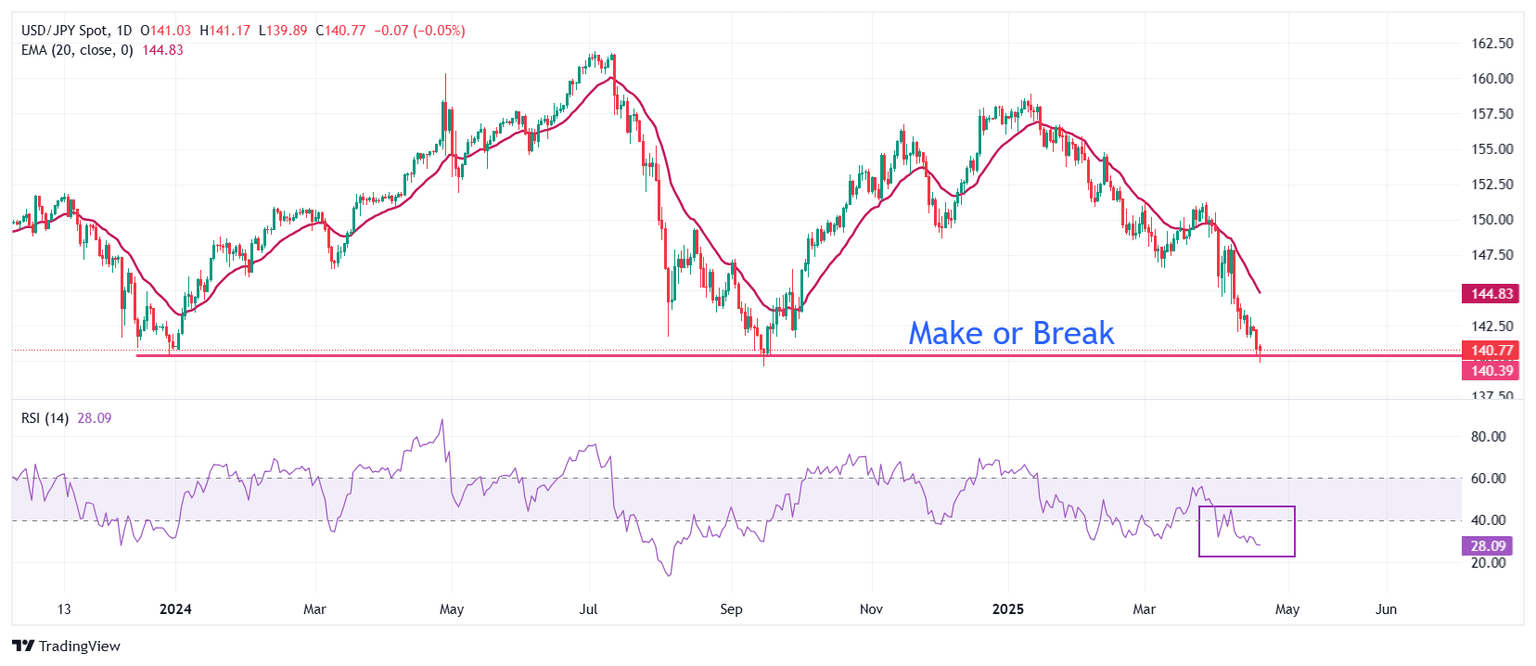 USD/JPY trades at a make-or-break point near the psychological level of 140.00. The outlook of the pair is strongly bearish as the 20-day Exponential Moving Average (EMA) is sloping downwards, which trades around 144.80.